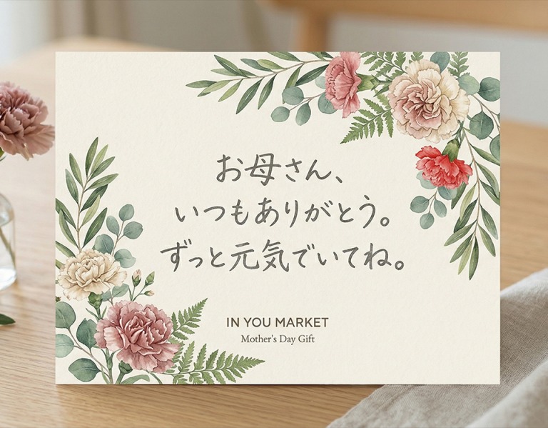 「すぐ配(即日配送)」対象のギフト商品をご購入いただいた方限定で、IN YOU MARKETオリジナルの母の日メッセージカードを無料でお付けいたします。 普段は照れくさくてなかなか口にできない「ありがとう」の気持ち。 こだわりのオーガニックギフトに、あなたの言葉を添えて直接お届けします。